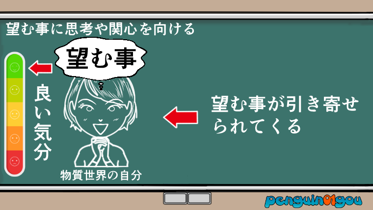 もし僕たち自身が「望む事」に思考や関心を向けているのなら、「内なる存在」は心地いい「ポジティブな感情」を僕たちに与えて、「今あなたは、正しい方向に意識を向けているよ!」っと言う事を教えてくれます。(下記イラスト参照↓)