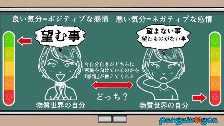 その大切な役割とは、たった今自分自身が、「望むこと」に意識を向けているのか、それとも「望まないこと」、または「望むものがない」ことに意識を向けているのかと言うことを、「良い気分=ポジティブな感情」と「悪い気分=ネガティブな感情」として教えてくれています。(下記イラスト参照↓)
