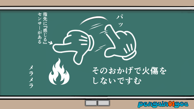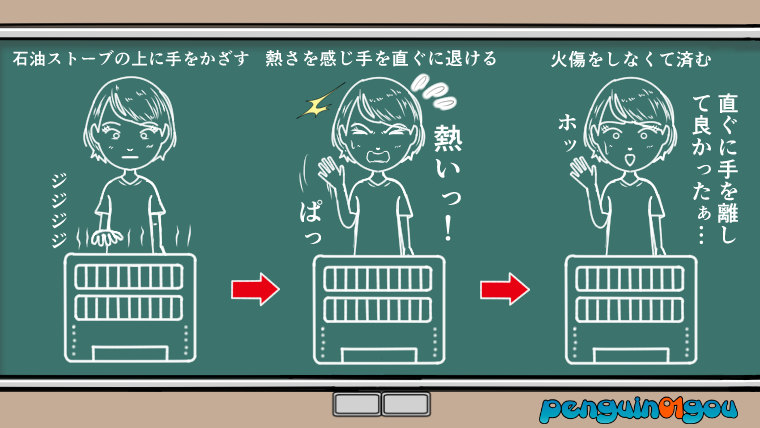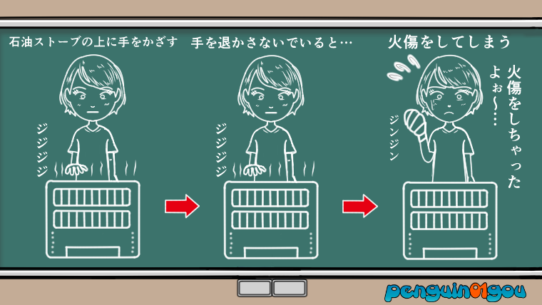 でももし仮に、石油ストーブの上に手をかざし続けて、熱さを全く感じずに手を退(ど)かさないでいたらどうなってしまうでしょうか?いずれは大火傷をしてしまう事になります。(下記イラスト参照↓)
