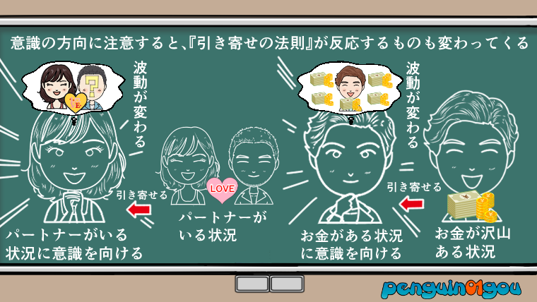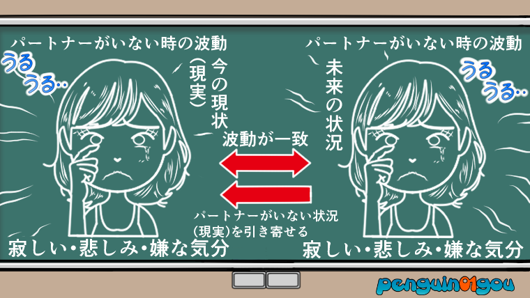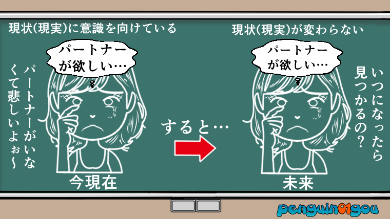 …っと言うことはつまり、もし「パートナーがいない」という現状(現実)を観察し、「パートナーがいない」っという波動を周囲に放っていると、当然引き寄せられてくる現状(現実)は、「パートナーがいない」という現状(現実)を引き寄せてしまう事になります(下記イラスト参照↓)