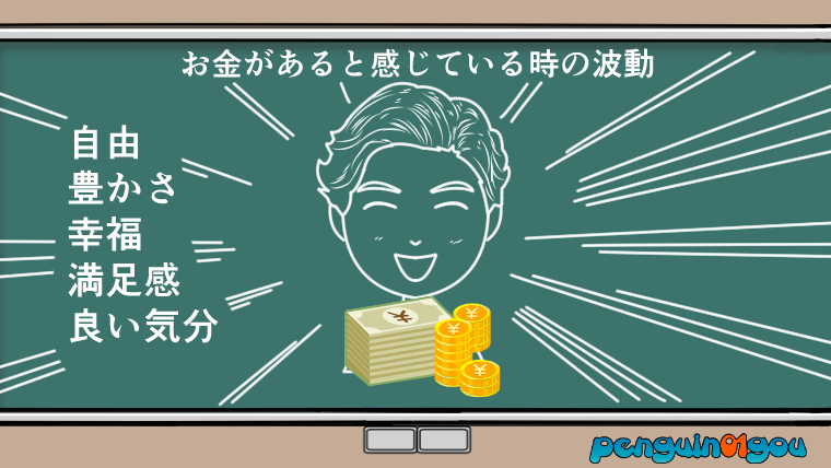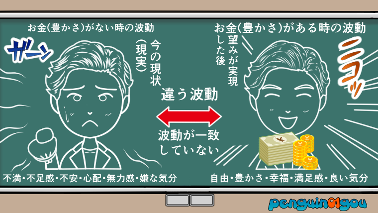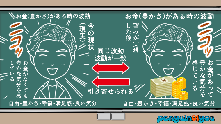 お金(豊かさ)を求めている場合も全く同じで、お金(豊かさ)を望んでいるならば、今、この瞬間、「お金(豊かさ)がある」っという気分(感情)を感じ、望みが実現した時と全く同じ波動を出す事です。(下記イラスト参照↓)
