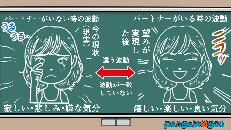 「求めているパートナーがまだいない」っと言う、今目の前に見えている現状(現実)を観察している時に感じる気分、そして、その時に周囲に放っている波動と、「求めているパートナーがいる」っと言う、望みが実現した後に感じる気分、そして、その時に周囲に放っている波動には、大きな違いがありますよね?(下記イラスト参照↓)