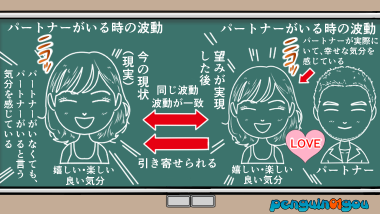 その方法は凄くシンプルで、例えばパートナーを望んでいる場合ならば、今、この瞬間、「パートナーがいる」っという気分(感情)を感じ、望みが実現(パートナーがいる)時と全く同じ波動を出す事です。(下記イラスト参照↓)