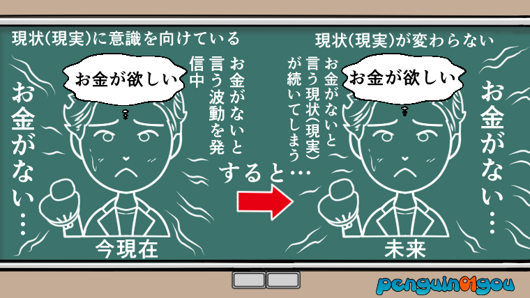 …っと言うことは、もし今「お金(豊かさ)がない」という現状(現実)を観察し、「お金(豊かさ)がない」っという波動を周囲に放っていると、当然引き寄せられてくる現状(現実)は、「お金(豊かさ)がない」という現状(現実)を引き寄せてしまう事になります。(下記イラスト参照↓)