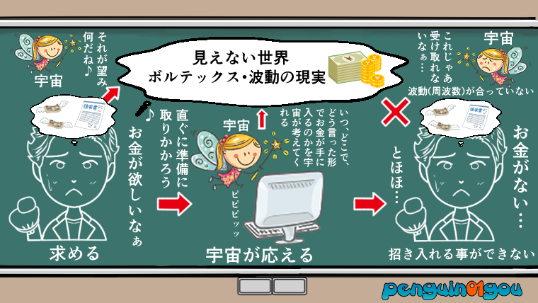 お金(豊かさ)を求めている場合でも同じで、「お金(豊かさ)が欲しい」と求めても、「今求めているお金がない」と言うない現状に関心を向けていると、ボルテックス(波動の現実)と波動を一致させることはできません。(下記イラスト参照↓)