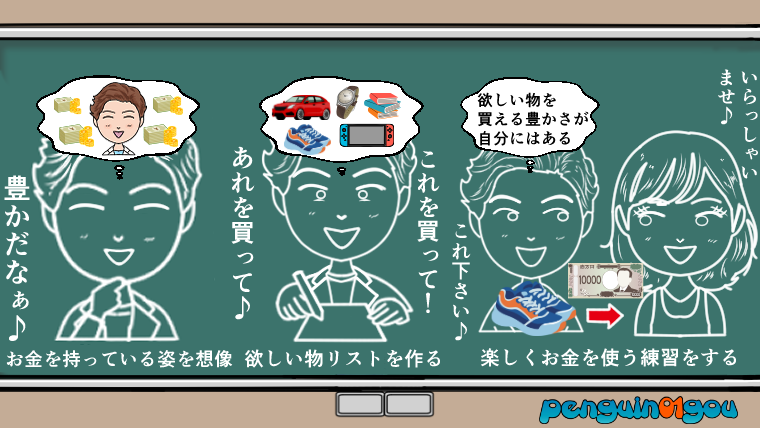 お金(豊かさ)を求めている人ならば、お金を沢山持っている姿を想像(妄想)してみたり、お金があったら買いたい欲しいものリストを作成してみたり、実際に豊かさを感じてみるために、楽しくお金を使う練習などをしてみるといいそうです。