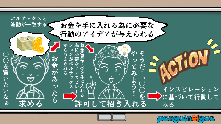 あとは、ボルテックス(波動の現実)の波動と自分が放つ波動を一致させる事ができれば、ボルテックス(波動の現実)の中に用意された「お金を手に入れる為に必要な行動のアイデア」を、インスピレーション(直感)と言った形で受け取る事ができます。
