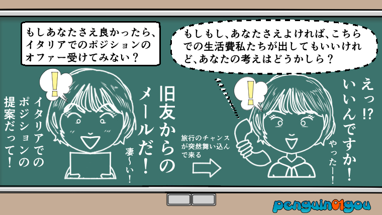 体験者・『そして、1ヶ月半ほど実践した頃、旧友からメールが届き、イタリアでのポジション—–文化交流のために、そこの家庭で暮らすこと—–の提案を受けたのです!