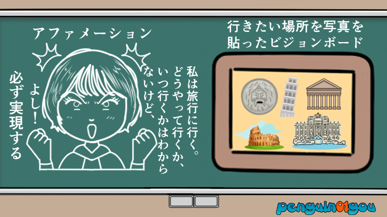 • 「私は旅行に行く。どうやって行くか、いつ行くかはわからないけど、必ず実現する」っと言ったポジティブな宣言(アファメーション)をする