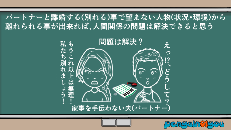 家事を手伝ってくれないパートナーに悩まされている人の場合、そのパートナーと離婚する(別れる)事ができれば、望まない人物(家事を手伝ってくれない夫)がいる状況や環境から直ぐに離れることはできると思います。(下記イラスト参照↓)