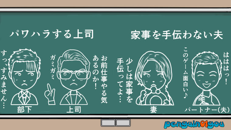 職場でパワハラする上司であったり、家事を一切手伝わない夫(パートナー)などなど、こう言った人間関係での悩みというものは、多かれ少なかれ誰にでもあるものだと思います。(下記イラスト参照↓)