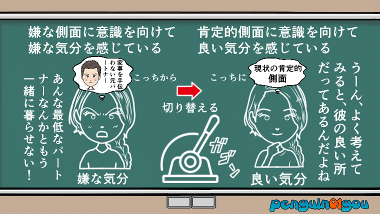 相手の嫌な側面にだけ意識を向けるのをやめて、少しでも相手の肯定的な側面に意識を向ける事ができれば、嫌な気分から良い気分に、自分の気分(感情)を変える事ができると思います。(下記イラスト参照↓)