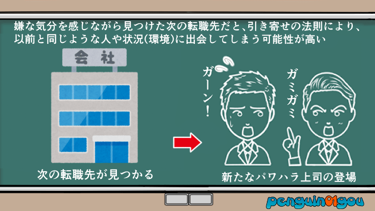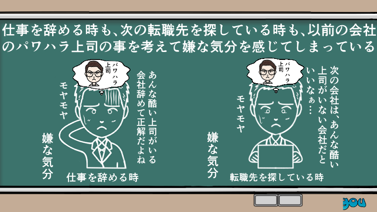 ただ問題は、会社を辞めることで嫌な人や環境(状況)から物理的に離れる事は簡単にできるのですが、会社を辞めて次の転職先を探している時でも、以前の会社のパワハラ上司の事を考えて、嫌な気分を感じてしまうってことありませんか?。(下記イラスト参照)