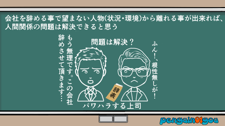例えばパワハラ上司に悩まされている人の場合、会社を辞める事で、望まない人物(パワハラ上司)がいる状況や環境から離れることは直ぐにできると思います。(下記イラスト参照↓)