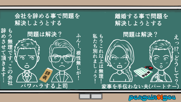 そして、こう言った望ましくない人や状況に直面した場合、多くの人にとって一番手取り早い解決策は、直ぐに会社を辞める、直ぐに離婚(別れる)するなど、望まない人や場所から物理的に離れる事だと考えると思います。(下記イラスト参照↓)