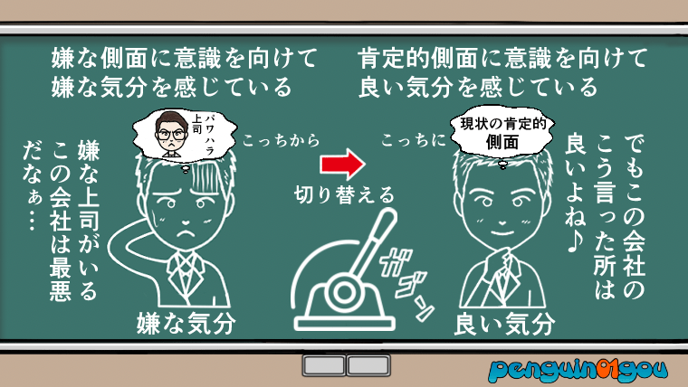 すると、そう言った肯定的側面に意識を向けていると、嫌な気分から良い気分に、自分の気分(感情)を変える事ができると思います。(下記イラスト参照↓)