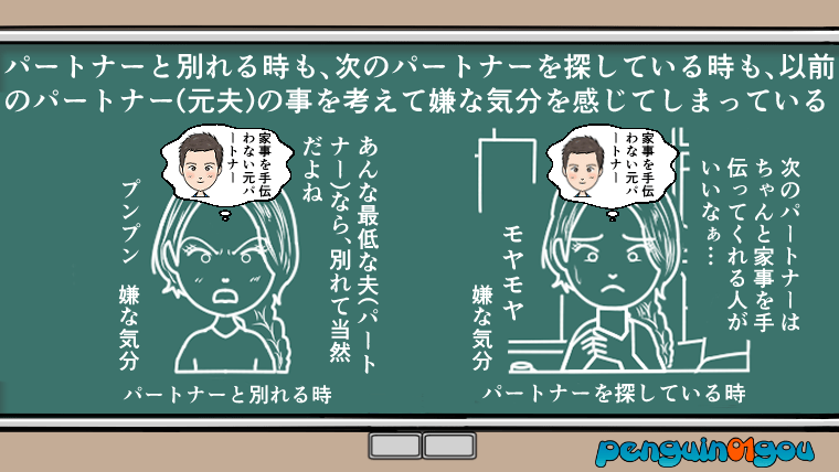 でも、夫(パートナー)と別れることで嫌な人や環境(状況)から物理的に離れる事は直ぐにできるのですが、元夫(パートナー)と別れ次のパートナーを探している時も、以前の元夫(パートナー)の事を考えて、嫌な気分を感じてしまう事ってありませんか?。