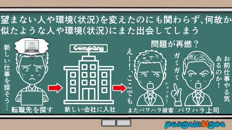 パワハラ上司に悩まされて、会社を辞める決断をします。そして、新しい仕事先を探し、新しい会社を見つけて入社をしたとします。ただその会社にもパワハラ上司が存在し、何故かまた同じパワハラ被害を受けるハメになってしまいました。(下記イラスト参照↓)