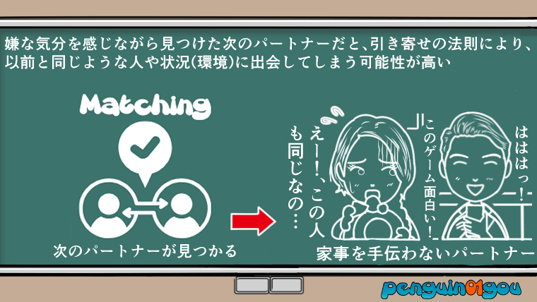 そして、その嫌な気分を感じながら探して見つけた次のパートナーだと、引き寄せの法則により、その時感じているネガティブな感情(嫌な気分)にマッチした人物に出会う可能性がとても高いです。