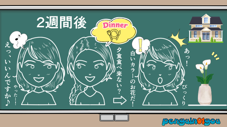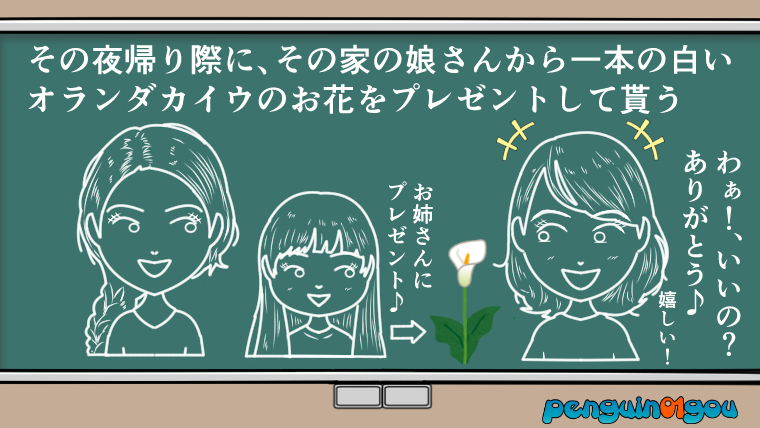 その夜、玄関の外に出ると、その友人のお嬢さんが彼女に一輪の白いオランダカイウの花を花瓶から取り出し、彼女の手に渡したのでした!